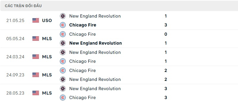 Xét về thành tích đối đầu, cả hai đội tỏ ra khá cân bằng. Trong 5 lần gặp nhau gần nhất, Chicago Fire và New England Revolution chia nhau mỗi đội 1 chiến thắng, còn lại có tới 3 trận hòa. Điều này phản ánh sự giằng co và khó phân thắng bại mỗi khi họ chạm trán.