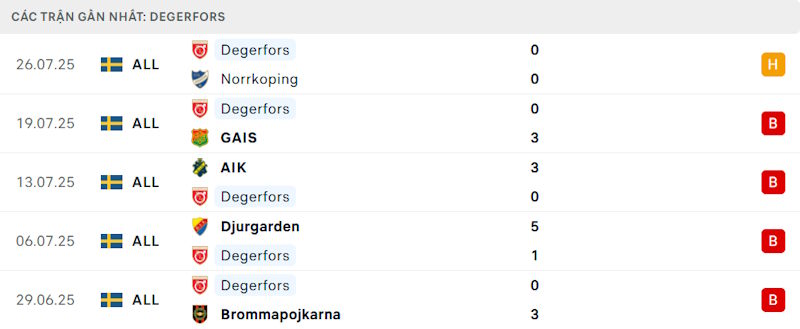 Degerfors IF khởi đầu mùa giải 2025 với quyết tâm lớn sau khi thăng hạng mùa trước, nhưng hiện thực lại phản ánh một bức tranh khác hoàn toàn. Trong 5 trận gần nhất tại Allsvenskan, họ thất bại toàn bộ, cùng lúc nhận số bàn thua nhiều nhất toàn giải. Thậm chí, thầy trò HLV Henok Goitom không giành được điểm nào trong 5 trận ra quân vừa qua ngoại trừ màn cầm hòa Norrkoping không bàn thắng.
