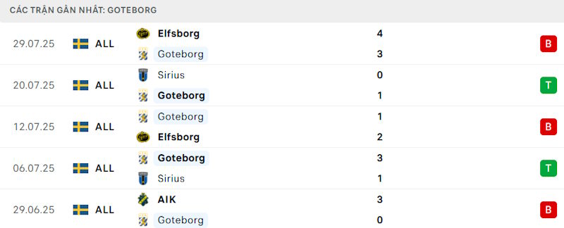 Thống kê đối đầu cho thấy Goteborg hoàn toàn chiếm ưu thế với 7 thắng, 2 hòa và chỉ 2 thua trong 11 lần gặp nhau gần nhất. Đáng chú ý, những chiến thắng của đội chủ nhà thường có cách biệt rõ ràng như trận thắng đậm 6‑0 vào năm 2023, hay chiến thắng 3‑1 ngay trên sân Degerfors vào tháng 5/2025.