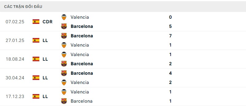 Thành tích đối đầu giữa Barcelona vs Valencia