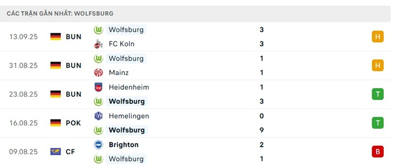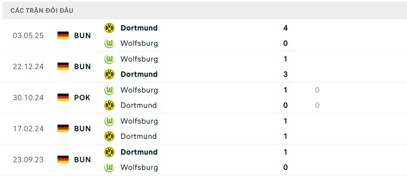 Phong độ của Borussia Dortmund vs Wolfsburg gần đây