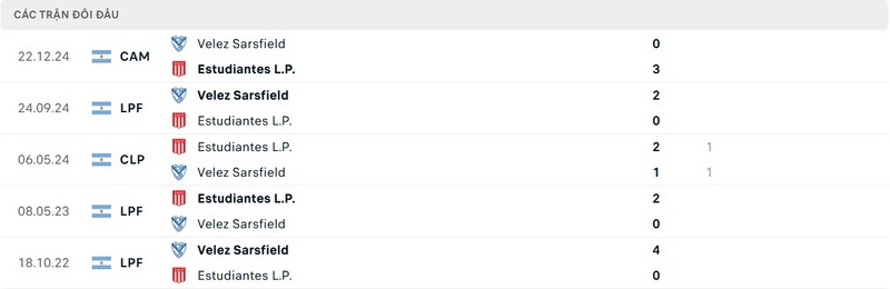 Thành tích đối đầu giữa Estudiantes vs Velez Sarsfield