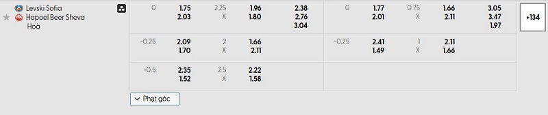 Bảng tỷ lệ kèo Levski Sofia vs Hapoel