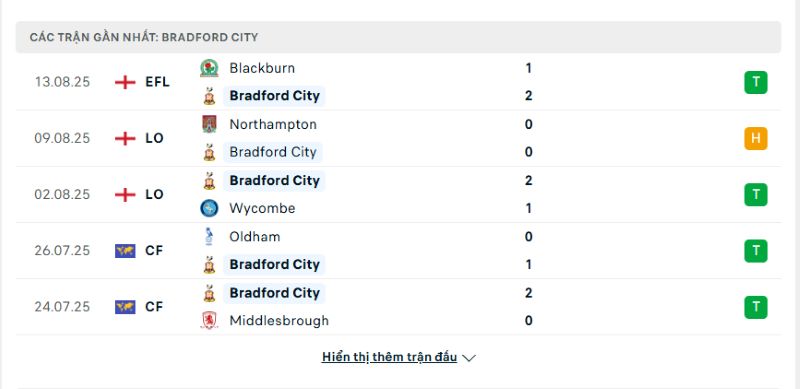 Soi kèo Stockport vs Bradford City đang nỗ lực thích nghi với nhịp độ cạnh tranh khốc liệt của League One. Đội bóng này đã có khởi đầu không tệ với chiến thắng 2-1 trước Wycombe ở trận mở màn mùa giải 2025/2026. Trong 5 trận gần nhất, Bradford giành 4 chiến thắng và hòa 1. Hàng công của họ ghi được 7 bàn. Hàng thủ cho thấy sự chắc chắn khi chỉ để lọt lưới tới 3 bàn.