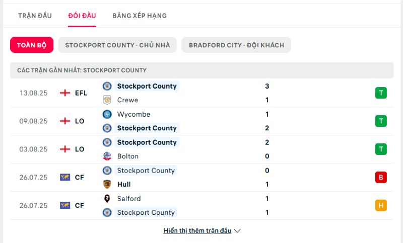 Thành tích đối đầu giữa Stockport vs Bradford City